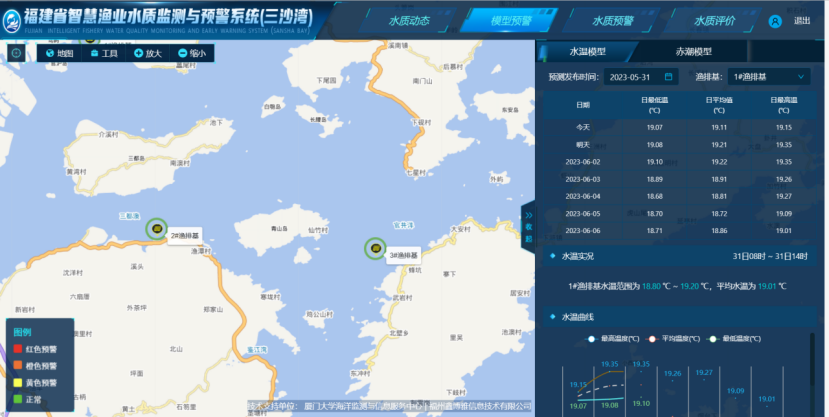 系统通过调用水温模型,实时展示未来6天的水温状况,并用不同颜色和图例标识水温预警状况;通过调用赤潮模型,实时展示未来三天内的赤潮发生概率,并用不同颜色和图例标识不同赤潮预测等级。