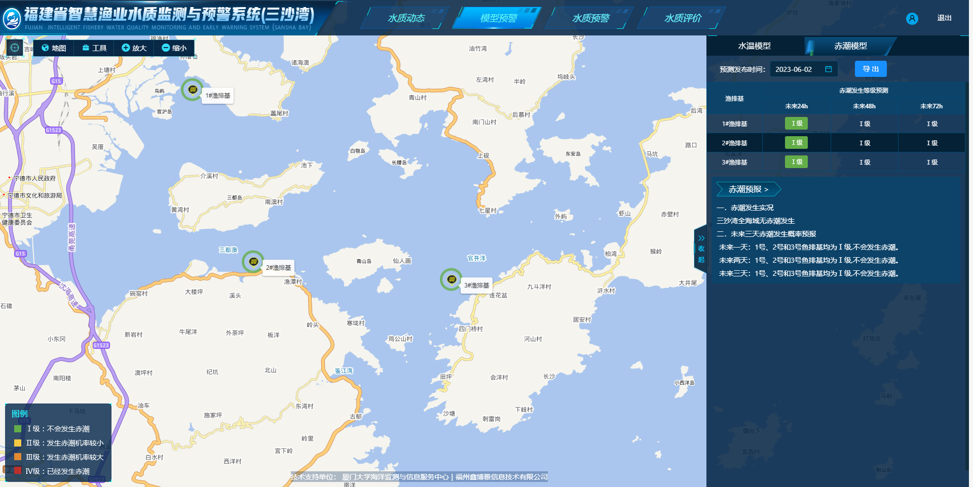 目前,该赤潮监测预警模型已成功应用于厦门湾、三沙湾、同心湾等海域,分别部署在福建省海洋预报台、厦门市海洋与渔业研究所、福建渔业资源监测中心业务化运行,为有关业务管理部门提供及时、有效的赤潮预警信息服务,为福建省近海有害赤潮防控、渔业生态安全保障提供技术支撑和科学依据。