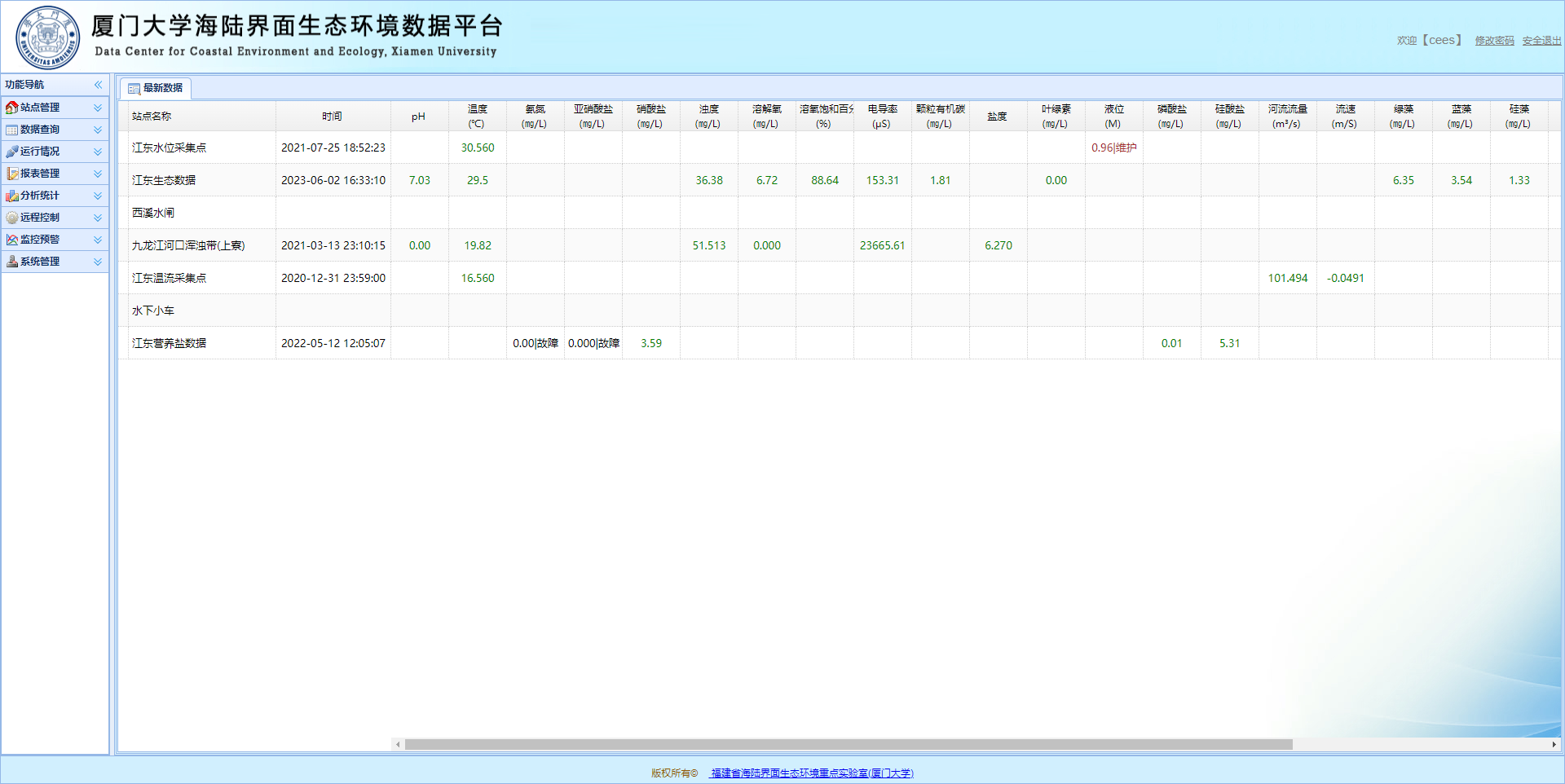 系统实时展示了温流数据(水温计温度、层析仪温度、流速、假定基面水位、流量)、营养盐数据(氨氮、硝酸盐、亚硝酸盐、磷酸盐)、生态参数(绿藻、蓝绿藻、硅藻、隐藻、黄色物质、颗粒有机碳、CDOM、藻红蛋白、藻青蛋白、叶绿素)、水质参数(pH值、浊度、电导率、水温(BBE)、溶解氧、溶氧饱和百分比)、河流入海通量(氨氮、硝氮、总无机氮、无机磷)以及项目取水点及集装箱监测平台内的实时视频监控。