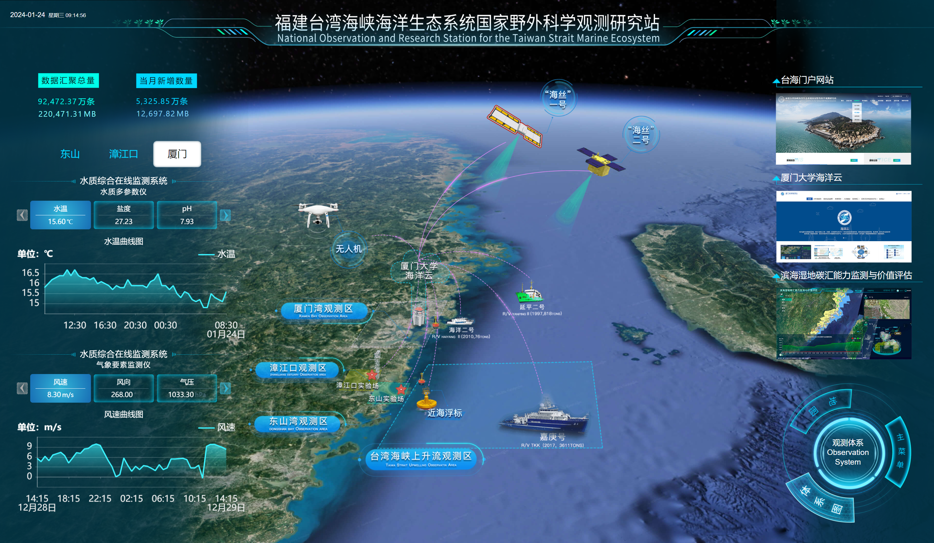基于厦门大学和台海站构建的“空-天-地-海”立体观测体系,实现水土气生多介质和界面通量等多维观测数据的汇聚,分期建设并不断完善海洋与海岸带生态系统综合数据库。数据库涵盖水文、气象、物理、化学、生物、生态,以及社会经济等多源异构数据。建立海洋云数据中心,根据不同观测平台和数据类型,制定数据汇聚标准化流程、数据库建设规范和数据汇交制度。